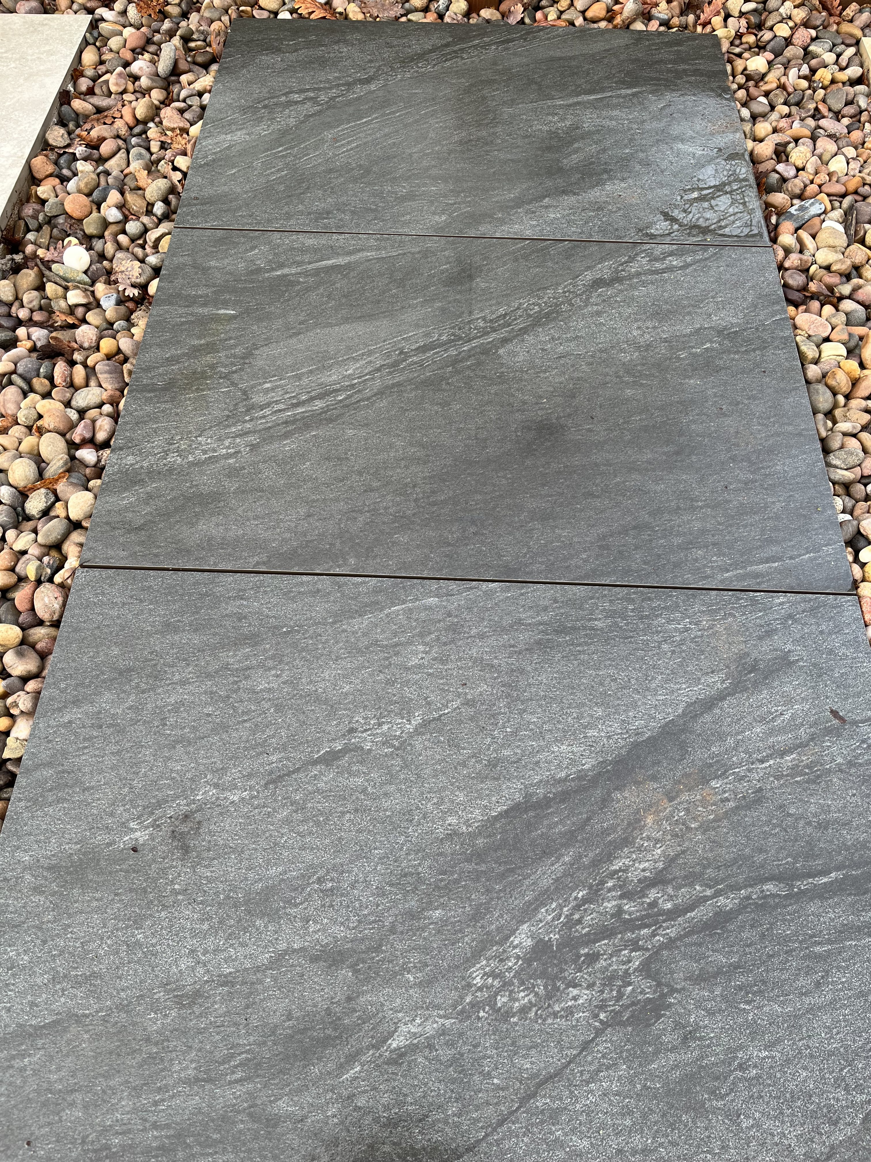 Rich depth of charcoal grey with subtle contours and aged stone textures designed to mimic hand cut traditional flagstones. The perfect blend of old charm and modern durability. A great option for any sophisticated outdoor area.