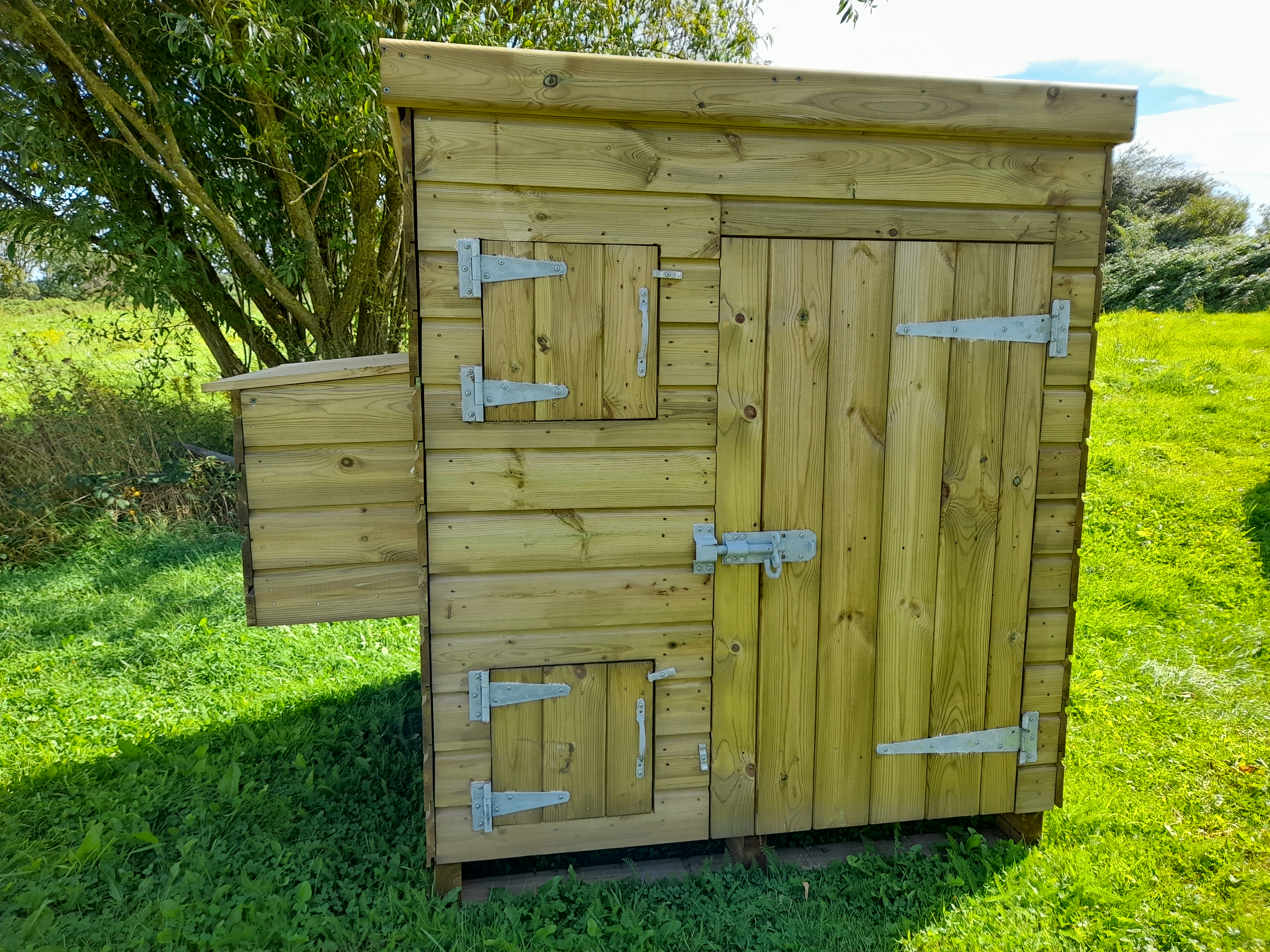 The flat packed Hutton Chicken House will have you collecting eggs in no time, accommodating up to 12 chickens and manufactured with the same grade and nominal thickness cladding as used in the high-quality Hutton Sheds. The nesting box includes a raised perch for the birds comfort and well-being with a drop down opening to the side for ease of collection, also a door to the front allows access for cleaning. Hot-dipped galvanized fixings add an extra level of durability to this product making this item the perfect choice.