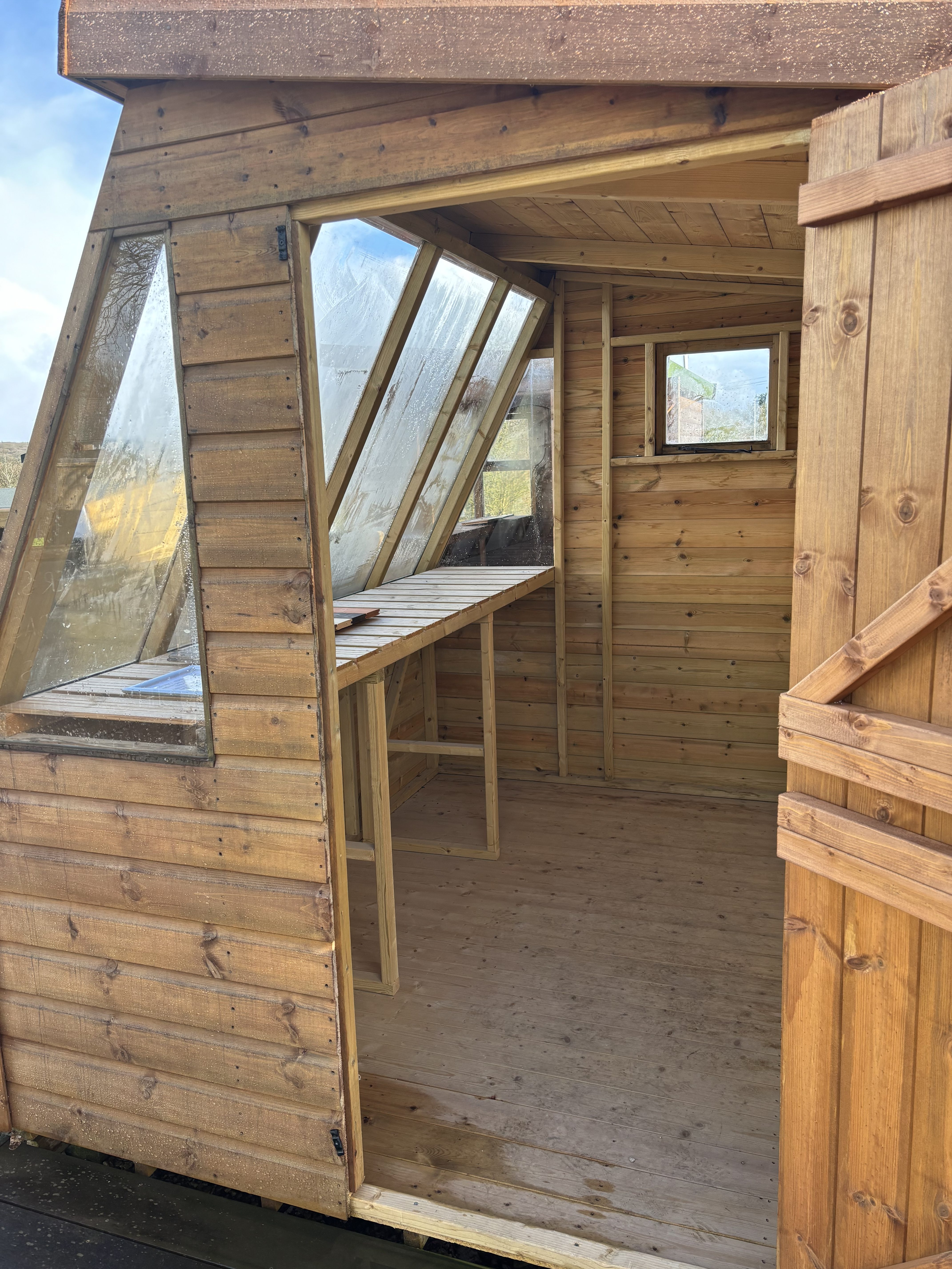 Front window is 12ft and the building has 4ft depth storage area and 6ft depth potting shed area |