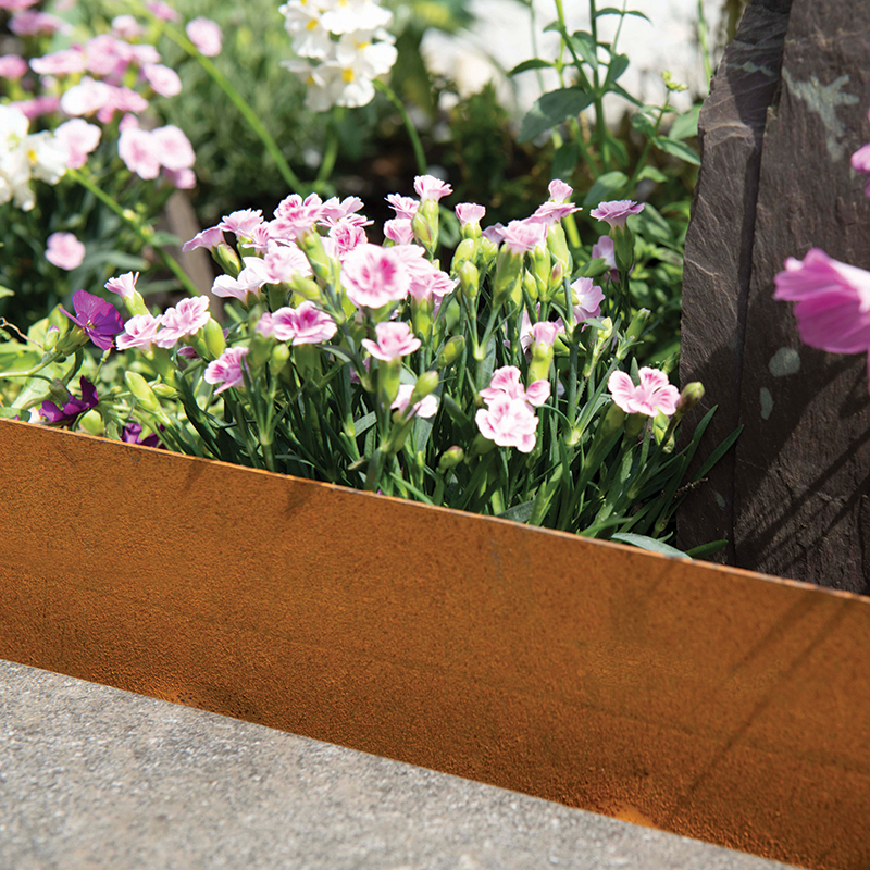 Flexi fix Corten is a rustic steel edging that offers a single solution with its integrated spikes and interlocking assembly.
