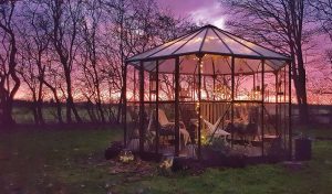 The pavilion is furnished with double sliding doors and three opening side windows for extra ventilation, so you feel as if you are sitting outside in the garden, but with the added bonus of being sheltered from the weather and surrounded by your plants.