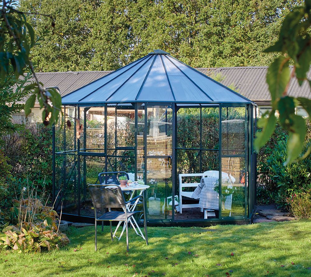 The pavilion is furnished with double sliding doors and three opening side windows for extra ventilation, so you feel as if you are sitting outside in the garden, but with the added bonus of being sheltered from the weather and surrounded by your plants.