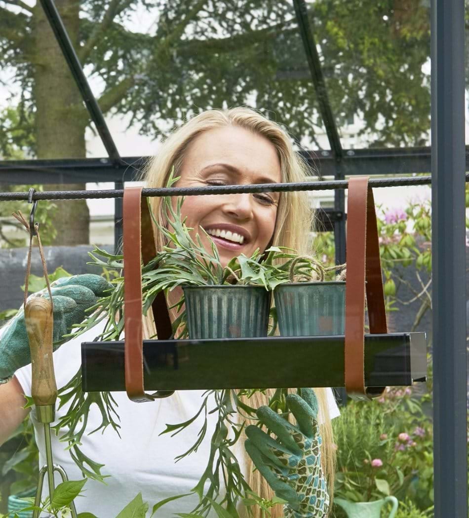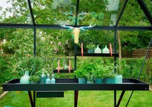 The Halls plant shelves are a versatile way of growing herbs in the greenhouse.