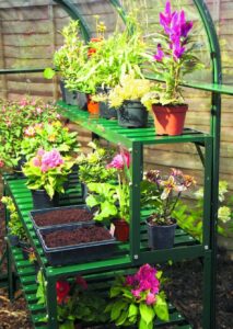 Halls greenhouse staging is available in green or silver to match your greenhouse and with one or two tiers.