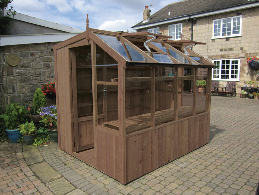Our fantastic potting sheds – available in two gable widths, the Jay (6’8) and Rook (8’9). Our innovative design enables growing room to be maximised while allowing for all important storage space. Two rear shelves are supplied as standard in addition to staging at the front of the shed. To aid ventilation there is an opening end window with manual stay and there are two opening automatic vents in the roof. There is also a fitted floor with plastic runners, designed to help prevent damp and extend the life of the building.