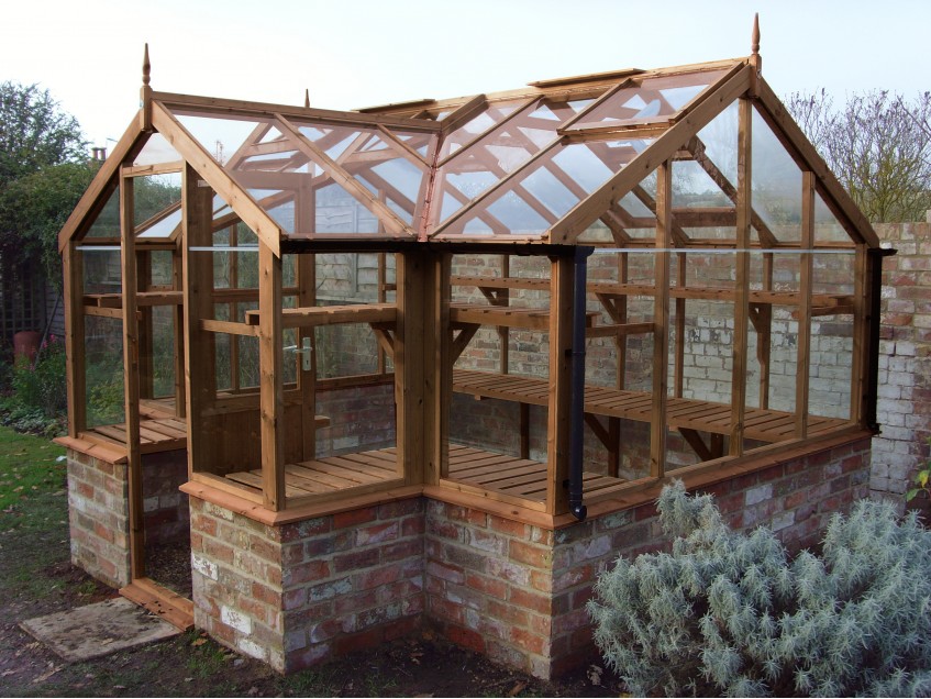 The greenhouse pictured was sited on a dwarf wall. However as standard the building is constructed upon a boarded base. Guttering and two front returned stagings are supplied as standard with this model.