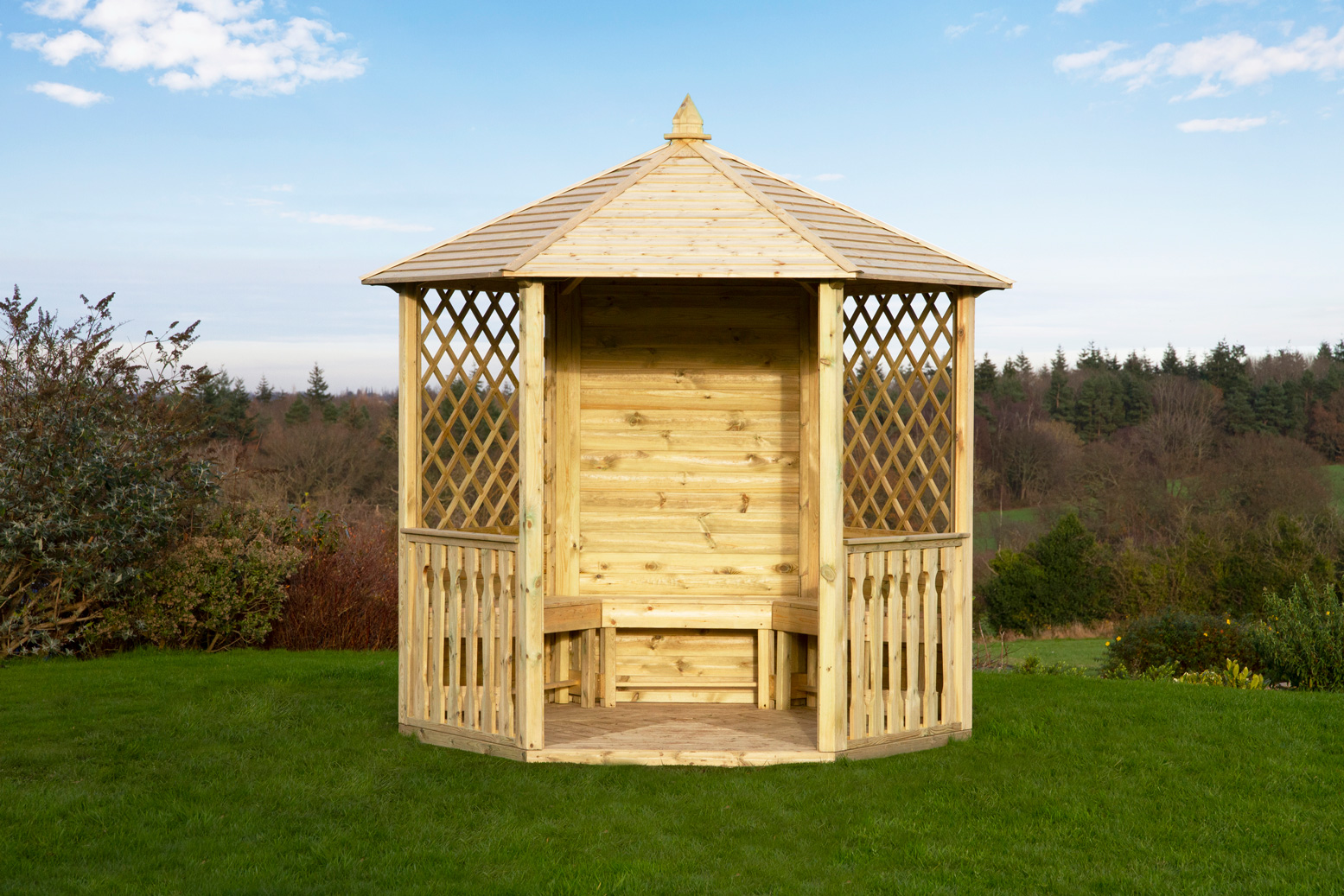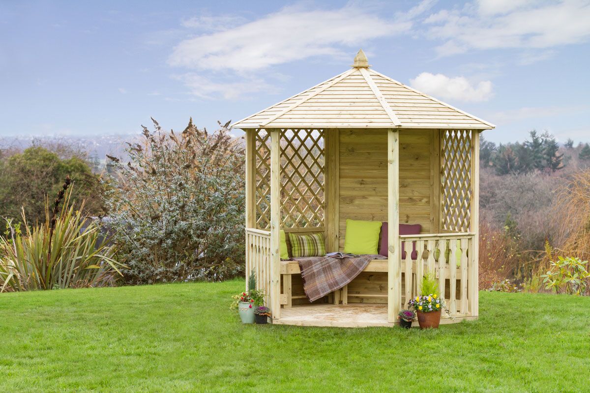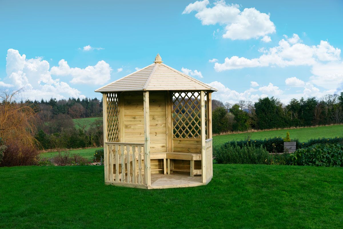 The Clifton Gazebo is beautifully designed with a solid groove panel at the back and two diamond trellis panels to each side of the entrance.