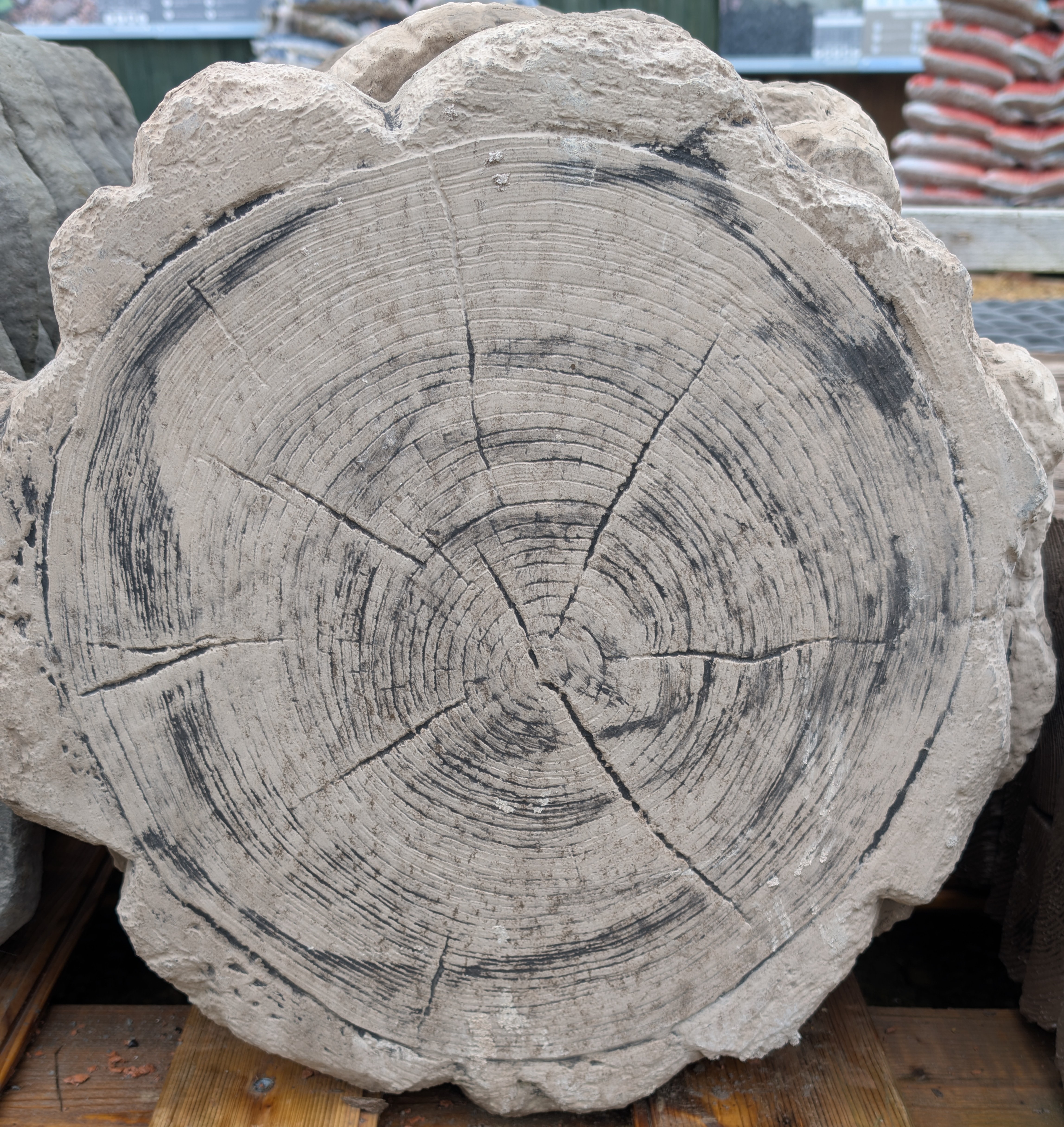 A circular, timber log effect, stepping stone with an authentic ringed, bark finish.